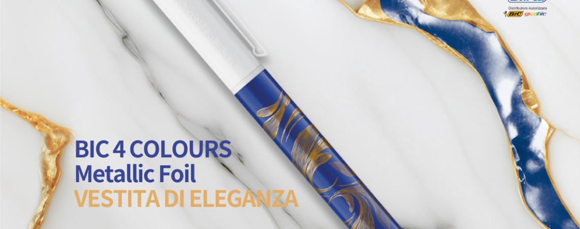 La nuova tecnica di stampa premium Metallic Foil in oro e argento conferisce alla nostra leggendaria penna BIC 4 Colours un tocco rinnovato, audace e senza tempo. L'originale e iconica penna a sfera con 4 colori di inchiostro è riconosciuta in tutto il mondo dal 1970. Rendi il tuo brand riconoscibile personalizzando la BIC 4 Colours con il logo della tua azienda. Contattaci per ricevere un preventivo e un'anteprima grafica gratuita!