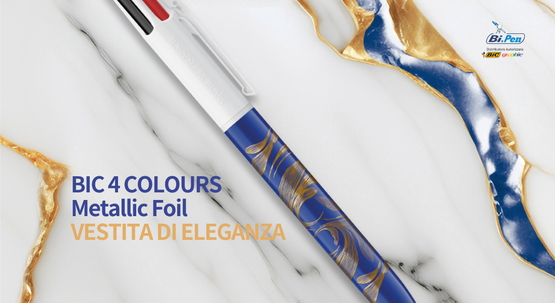 La nuova tecnica di stampa premium Metallic Foil in oro e argento conferisce alla nostra leggendaria penna BIC 4 Colours un tocco rinnovato, audace e senza tempo.